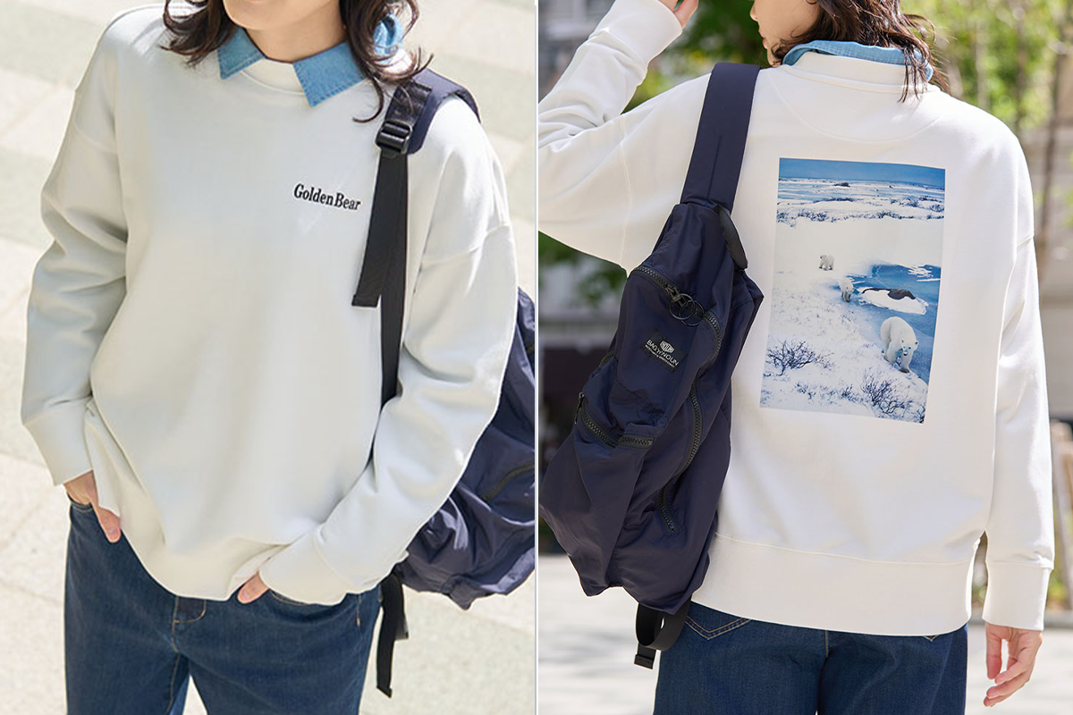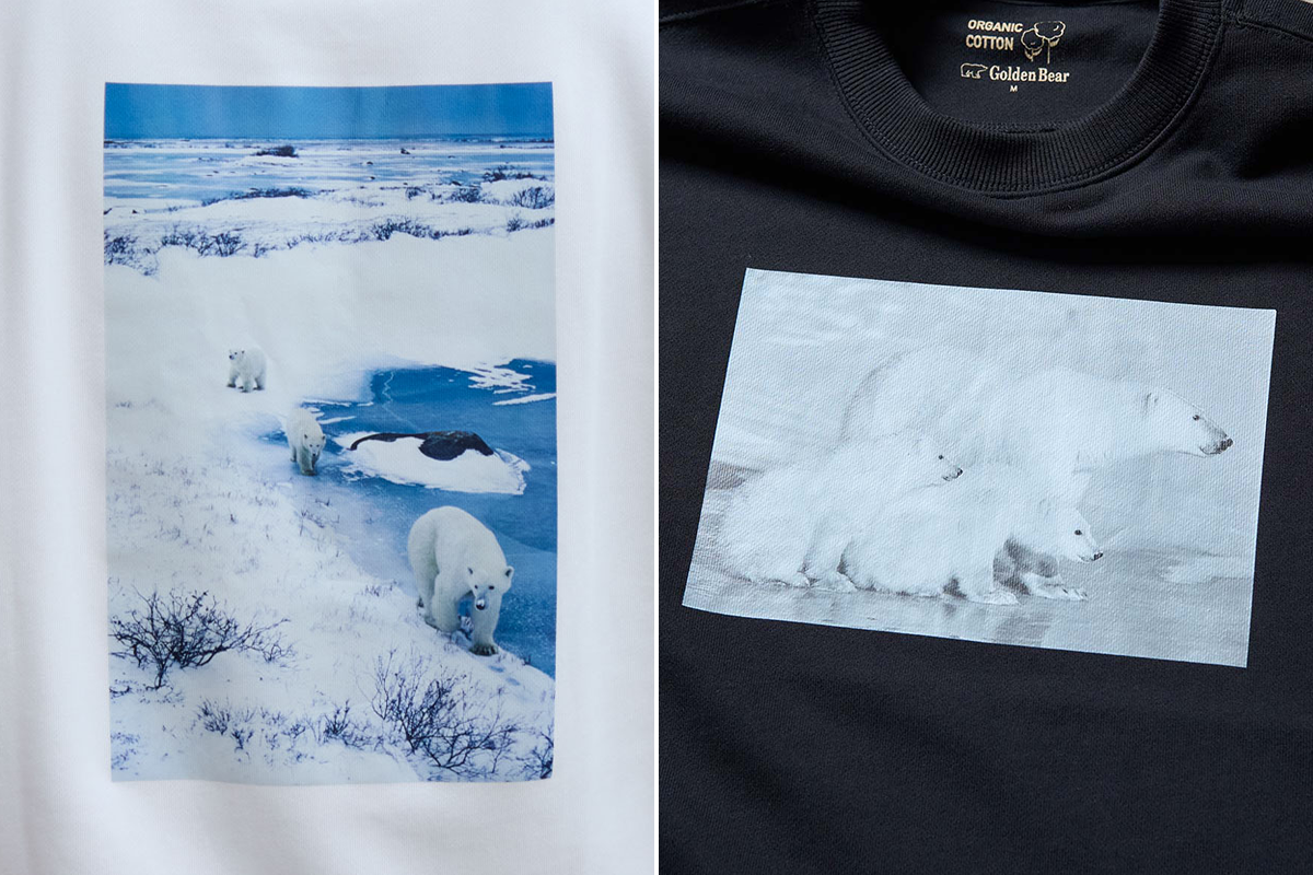 カラーはアイボリーとブラックの2色。アイボリーは胸に「Golden Bear」のロゴ、写真はバックプリントに。ブラックは正面に写真をプリントし、ロゴを左袖にあしらいました。