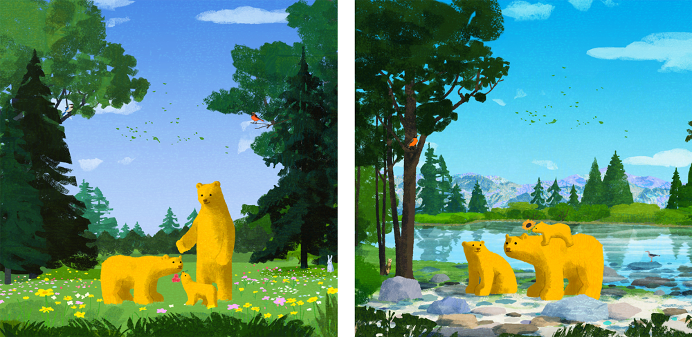 家族をテーマに描き下ろされたイラストには、春の森の中・初夏の湖畔とそれぞれのシチュエーションで小グマがお母さんとお父さんにお花を渡すあたたかなシーンが描かれています。