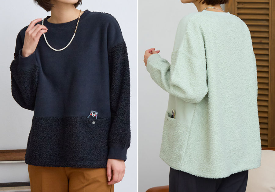 ふんわりとしたボアとなめらかなフリースの異素材切替で、見た目にも楽しいデザインに。ポケットにさりげなく、くまモンを忍ばせてあり、取り外し可能なので気分に合わせてアレンジをお楽しみいただけます。あたたかさと遊び心が詰まった、寒い季節のデイリースタイルにぴったりのアイテムです。
